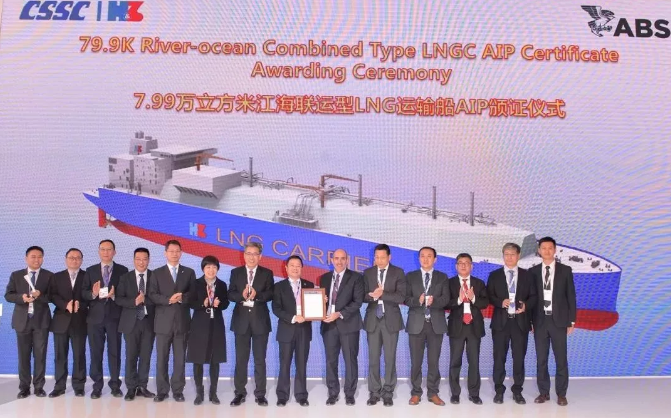 ????中國船舶集團所屬滬東中華造船(集團)有限公司推出了包括LNG-FSRU船、ARC7破冰型LNG船、350MV LNG發電船、V2.0版18600立方米LNG加注船在內的6款新船為中國船舶集團代言。12月4日,滬東中華獲得了由美國船級社頒發的全球首例7.99萬立方米江海聯運型LNG船AiP證書、由DNV GL船級社頒發的全球最大25000TEU集裝箱船AiP證書。