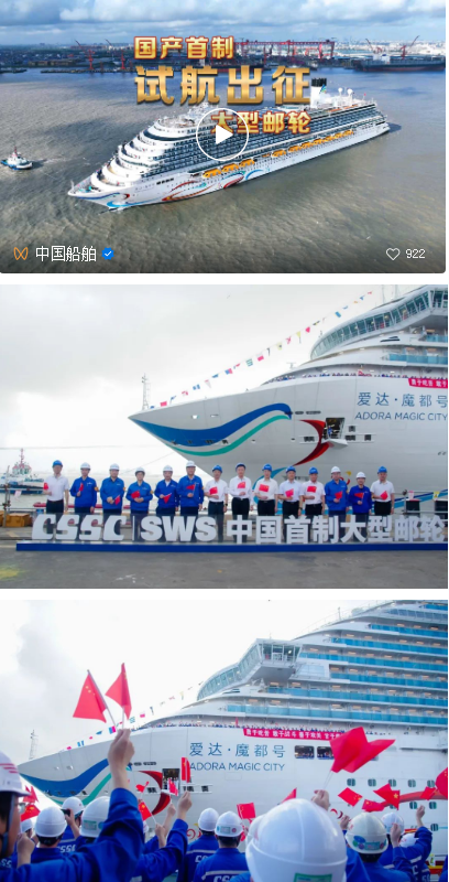 自2019年10月首艘國產大型郵輪開工建造以來,中國船舶集團及相關成員單位深入貫徹落實習近平總書記重要指示批示精神和黨中央決策部署,通過引進消化和自主創新,相繼開展了郵輪設計、建造、項目管理等專項攻關,項目工程穩步推進,各項節點順利完成,一系列科技創新成果落地開花。預計首制船將于今年底完工交付。