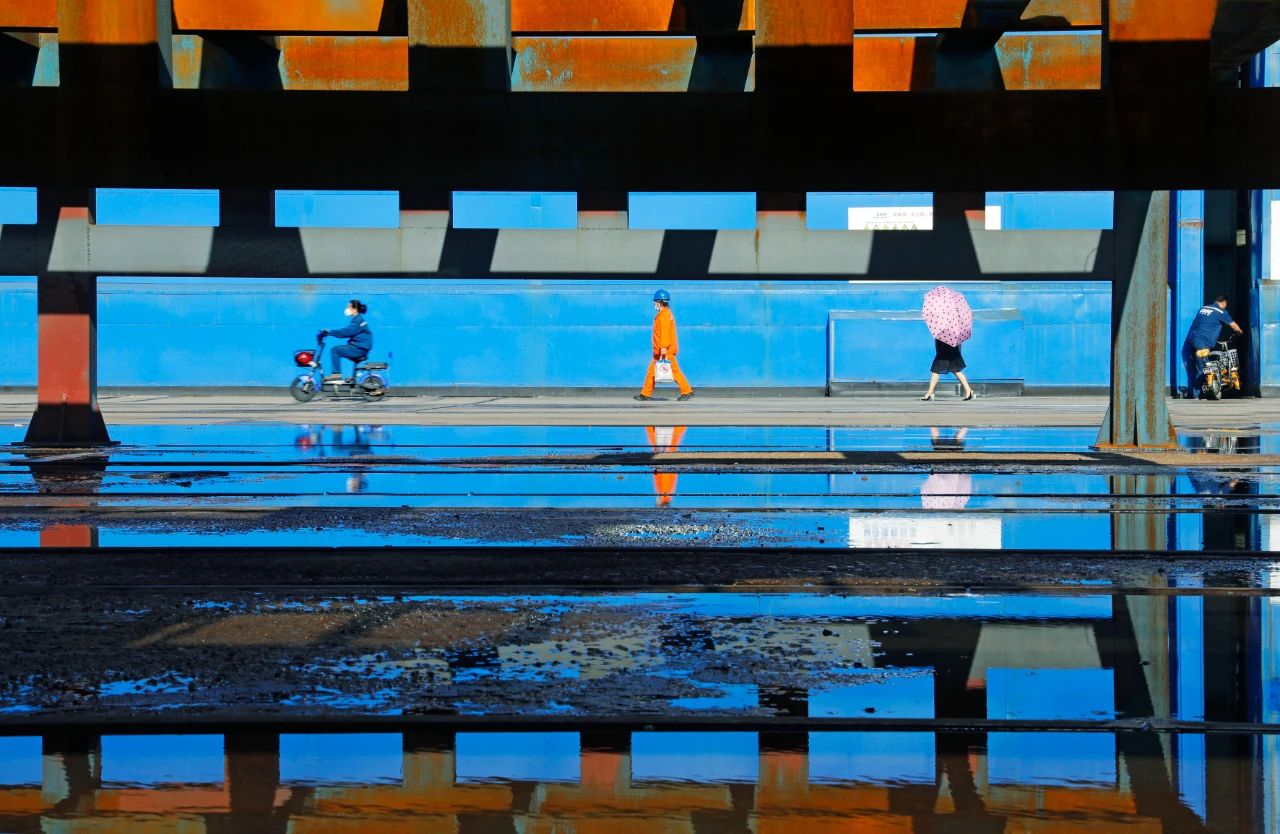 夏日清晨,一場大雨過后空氣透亮清新,廠區(qū)高跨門口服裝各異的職工行走在上班的路上,空地上擺放的工裝架與其自身的投影形成了獨特的畫框,讓畫面中行走的職工雖小卻很突出,起重工亮橙色的服裝、撐起的雨傘與明亮的藍色跨門形成色彩對比,使畫面活潑跳躍,職工們形形色色又從容有序,勾勒出廠區(qū)一隅的美麗風(fēng)景。