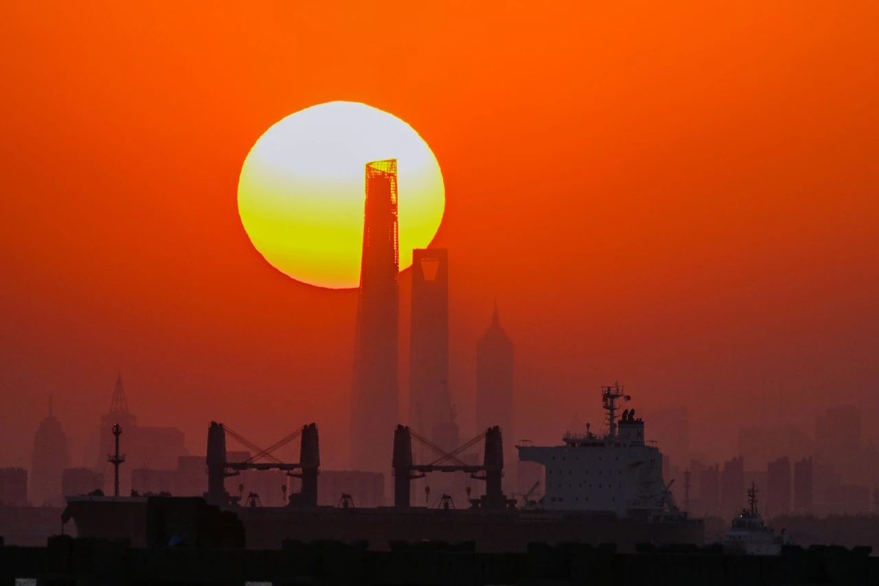 從距離陸家嘴33公里遠的橫沙島上遠眺“三件套”,夕陽從“三件套”穿過,此時一艘船駛?cè)氘嬅妫c夕陽形成近中遠三景。