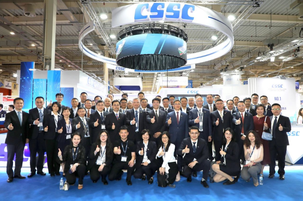 此次展會,中國船舶集團攜旗下19家成員單位參展,有關成員單位負責人率隊赴展會開展重點船海項目經營洽談并拜訪當地和周邊國家客戶。集團公司以“共贏未來”為參展主題,設置集團總體區、綠色航運解決方案區、低碳環保配套設備區共3個展示區域,重點展示了135500總噸大型郵輪、175000方LNG運輸船、24000箱超大型集裝箱船、210000噸氨燃料散貨船、LNG雙燃料VLCC等一系列高技術、高附加值明星產品,以及CPGC-WinGD 10X92DF-M甲醇雙燃料發動機、船用碳捕捉系統等全球船東高度關注的綠色低碳配套設備。同時,通過展臺上醒目的品牌標識、層級化的品牌體系圖、富有感染力的品牌推介視頻,首次面向全球客戶,立體化展示“中國船舶”品牌及下屬企業品牌和產品品牌體系,進一步強化了集團公司品牌形象。