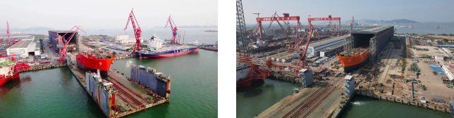 巨型總段“乘坐”移船小車和模塊小車登上浮船塢,奔赴室內船臺,完成主船體大合攏。