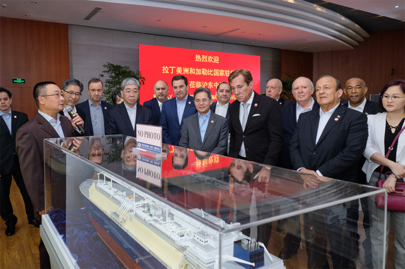 使節代表團先后參觀了中國船舶集團旗下滬東中華、江南造船,聽取了兩家企業重點產品、經營生產發展的總體介紹,并赴船塢、碼頭實地了解了在建的目前全球最大雙燃料23000TEU集裝箱船以及其他高技術、高附加值船舶建造情況。