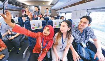 6月17日,100余名留學(xué)生從西安出發(fā),乘坐寶蘭高鐵試運行動車組前往蘭州,初次體驗即將開通運營的首條貫通新絲路高鐵。圖為幾名外國留學(xué)生在動車組試驗列車上自拍。唐振江攝(人民視覺)