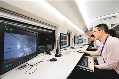 6月20日,西(安)成(都)高鐵陜西段聯(lián)調(diào)聯(lián)試正式啟動。圖為當(dāng)高速綜合檢測列車穿越秦嶺時,技術(shù)人員在監(jiān)測列車運行數(shù)據(jù)。新華社記者 李一博攝