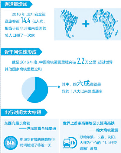 編織一張密度適宜的高鐵網(wǎng)絡(luò),造福盡可能多的民眾。十八大以來,我國高鐵版圖不斷延伸:2013年7月,穿越江南水鄉(xiāng)的寧杭高鐵開通;2014年6月,世界上一次性建成通車?yán)锍套铋L的高速鐵路蘭新高鐵建成通車;2016年12月,滬昆高鐵全線通車,彩云之南不再“邊緣”。截至2016年底,中國高鐵運營里程突破2.2萬公里,超過世界其他國家高鐵里程之和,除幾條線路外,2004年提出的“四縱四橫”高鐵網(wǎng)已全部建成。根據(jù)2016年7月新修訂的國家《中長期鐵路網(wǎng)規(guī)劃》(2016-2030年),預(yù)計到2020年,全國高速鐵路將增加到3萬公里。今年繼續(xù)保持高鐵網(wǎng)絡(luò)快速建設(shè)勢頭,就在上月初,寶蘭高鐵通車,將使千年絲路煥發(fā)更加蓬勃的生機。不久后,我們還將見證張呼客專馳騁于遼闊的大草原,而西成高鐵也將讓千年蜀道不再艱難。