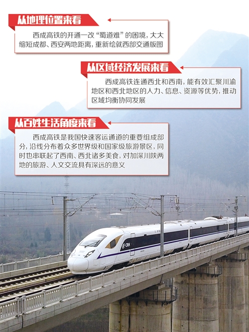從地理位置來看,西成高鐵將一改“蜀道難”的困境,大大縮短成都、西安兩地距離,重新繪就西部交通版圖。從區(qū)域經(jīng)濟(jì)發(fā)展來看,西成高鐵連通西北和西南,能有效匯聚川渝地區(qū)和西北地區(qū)的人力、信息、資源等優(yōu)勢,推動區(qū)域均衡協(xié)同發(fā)展。從百姓生活角度來看,西成高鐵是我國快速客運(yùn)通道的重要組成部分,沿線分布著眾多世界級和國家級旅游景區(qū),對加深川陜兩地的旅游、人文交流具有深遠(yuǎn)的意義。