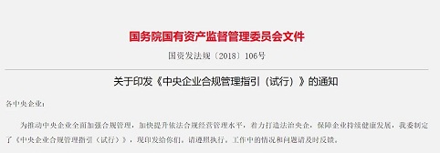 11月2日,國務院國資委印發了《中央企業合規管理指引(試行)》,推動中央企業全面加強合規管理,加快提升依法合規經營管理水平,著力打造法治央企,保障企業持續健康發展。