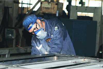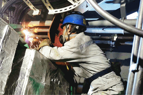中船應急電焊工正在進行電焊加工,全然無覺后背濕了大片。