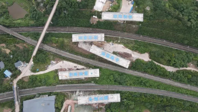 此次轉體的五段橋梁梁體為重慶新建快速路二橫線物流園區(qū)至禮白立交工程跨渭井、蔡歌聯(lián)絡線鐵路主線橋。