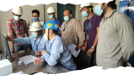 ▲用專業贏得信賴,海外某項目現場,制氫設備工程部員工加班加點開展設備調試,指導工作人員熟悉設備操作。圖為技術人員現場開展技術講解培訓。