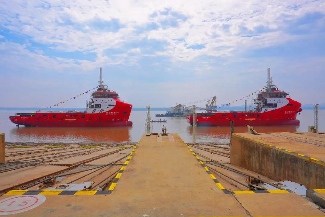 10月26日上午,中國船舶集團旗下武船集團為中海油田服務股份有限公司建造的兩型4000馬力LNG動力守護供應船3號船“海洋石油542”和“海洋石油547”下水。