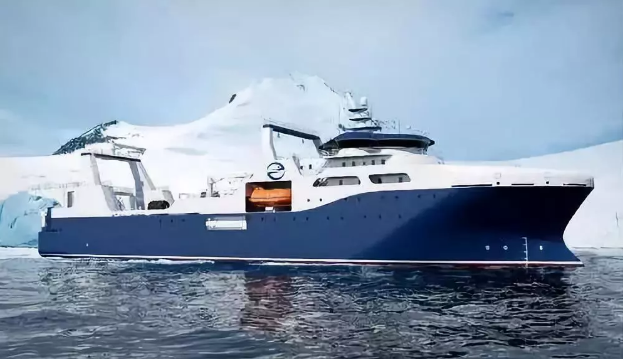 ????“深藍號”由黃埔文沖建造,七〇八所參與設計,總長約120米,型寬21.6米,設計吃水7.3米,設計航速15節,主機功率8000 千瓦,載重噸約5000噸。“深藍號”是我國自主研制建造的第一艘漁業捕撈加工一體船,也是目前最大最先進的漁業捕撈加工一體船,取得近200項知識產權保護,實現了我國現代化漁業船舶裝備領域的重大突破,達到世界先進水平;主要用于南大洋漁業捕撈,兼顧海洋科考功能,可滿足ICE-A冰區(冰厚度0.8米)及-25℃低溫環境的營運要求。