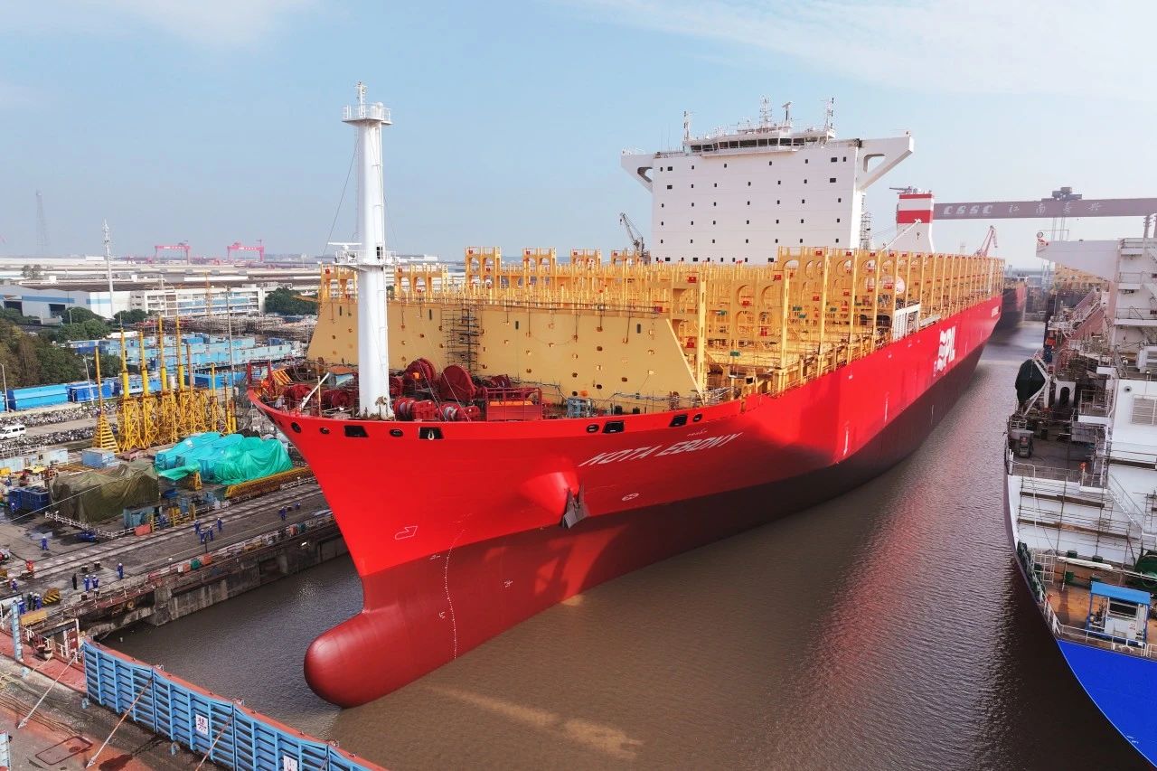 同步起浮的2艘半船是為新加坡太平船務(PIL)建造的14000TEU LNG雙燃料集裝箱船系列船第四艘的艏、艉半船。為了更好地進行船舶浮態對中,減少變形量,建造團隊開創了新的起浮方案,為后續集裝箱船樹立了半船起浮的新模式。
