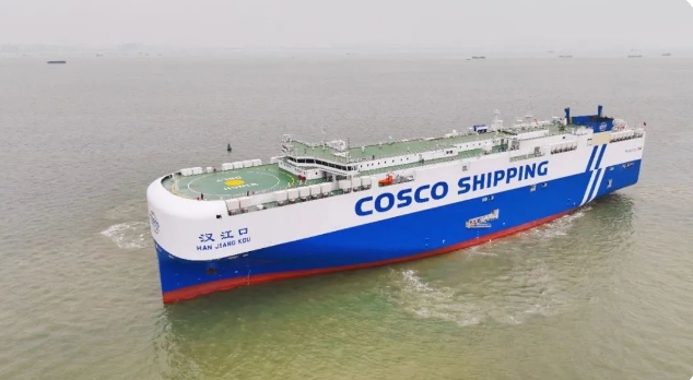 4月21日,中船集團(tuán)旗下廣船國際聯(lián)合中船貿(mào)易建造的7000車液化天然氣(LNG)雙燃料動力汽車運(yùn)輸船“漢江口”號舉行命名交船儀式。據(jù)了解,該船交付后,首航次將從上海裝載國產(chǎn)汽車奔赴智利、秘魯、危地馬拉等國家。