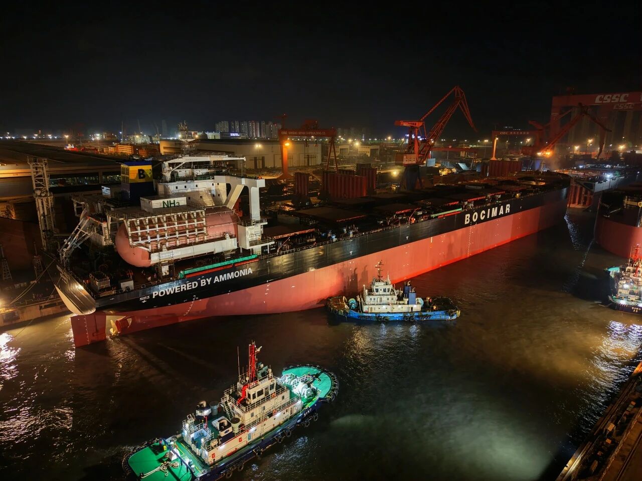北海造船為比利時(shí)CMB.TECH公司建造的21萬(wàn)噸氨燃料動(dòng)力散貨船45號(hào)船和54號(hào)船順利出塢。