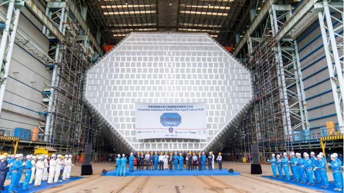 VLEC建造團(tuán)隊在船東、配套廠商和船級社等各方密切配合下,共同克服新冠肺炎疫情等不利因素,攻克B型液貨艙核心關(guān)鍵技術(shù)難點(diǎn),注重項目管理導(dǎo)向、革新工藝工法、鎳鋼焊接程序、薄板變形控制和優(yōu)化建造流程。從2019年12月底合同簽約到今天首制船的完工交付,總建造周期24個月,碼頭舾裝周期4個月,均開創(chuàng)了江南造船大型液化氣船首制船最短周期紀(jì)錄,實現(xiàn)了復(fù)雜船型節(jié)拍化建造。