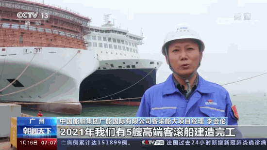 這里是中國船舶廣船國際的造船碼頭,多艘大型豪華客滾船正在緊張調(diào)試和建造。負責(zé)人告訴記者,2021年,像這樣的高端客滾船他們廠一共建造完工了5艘,產(chǎn)值占比達到約40%。