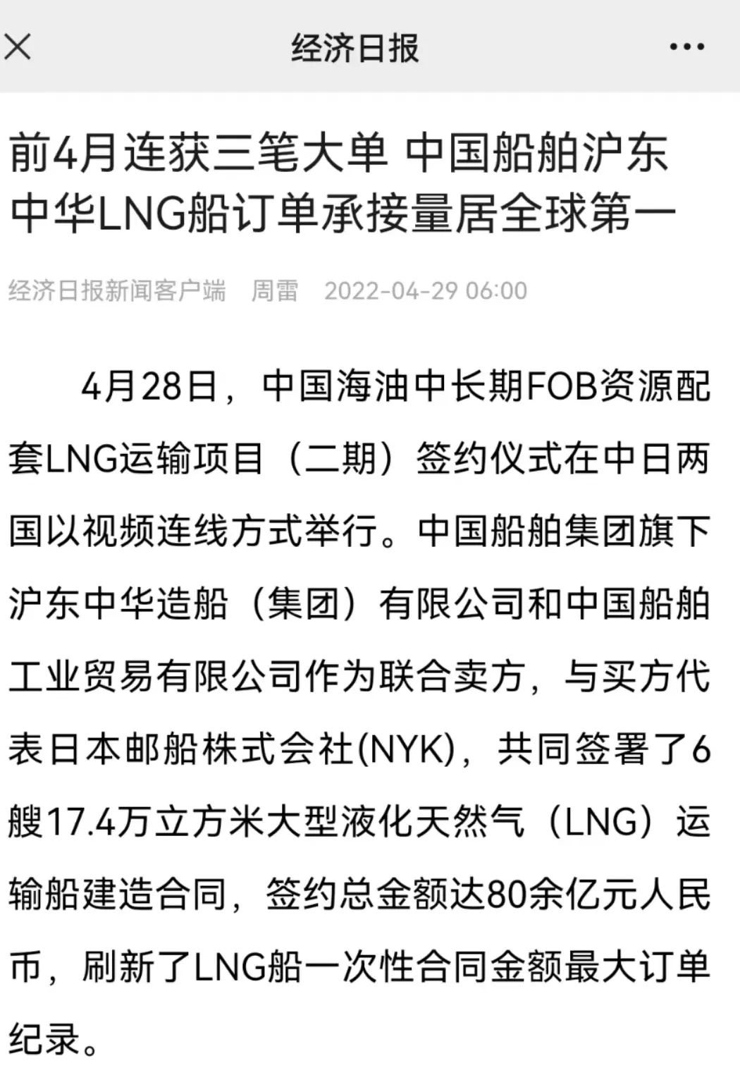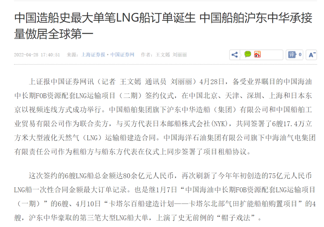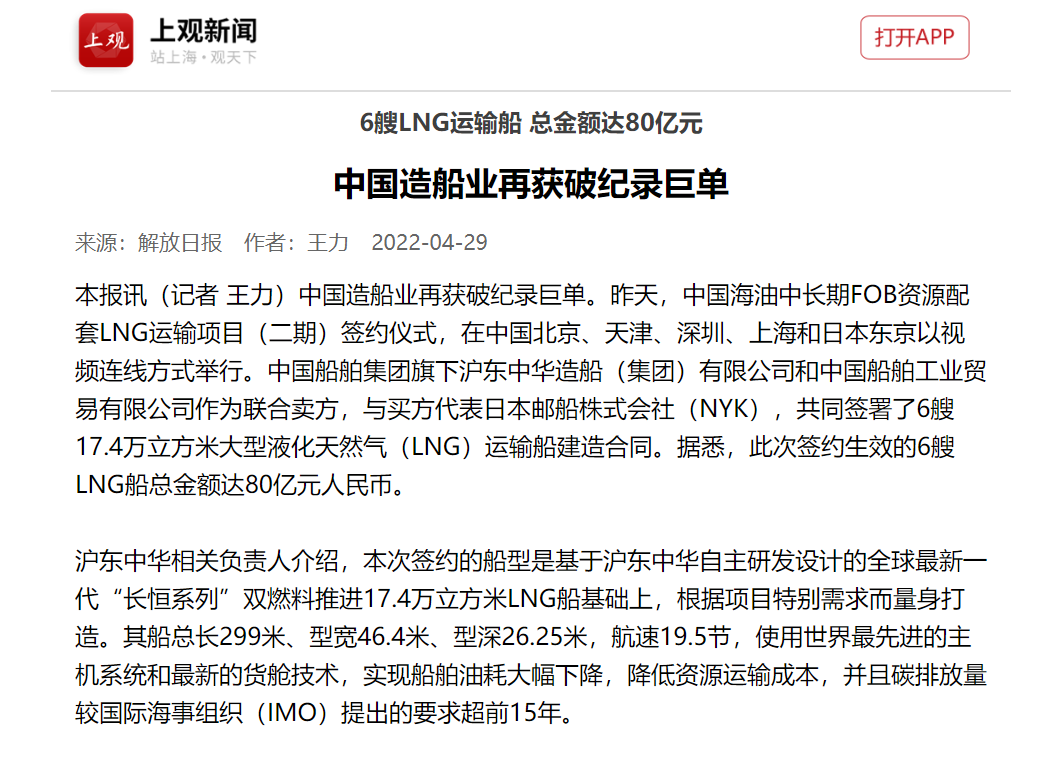 4月28日,中國(guó)海油中長(zhǎng)期FOB資源配套LNG運(yùn)輸項(xiàng)目(二期)簽約儀式,在中國(guó)北京、天津、深圳、上海和日本東京以視頻連線方式成功舉行。中國(guó)船舶集團(tuán)有限公司旗下滬東中華和中船貿(mào)易作為聯(lián)合賣(mài)方,與買(mǎi)方代表日本郵船株式會(huì)社(NYK),共同簽署6艘17.4萬(wàn)立方米大型液化天然氣(LNG)運(yùn)輸船建造合同。
