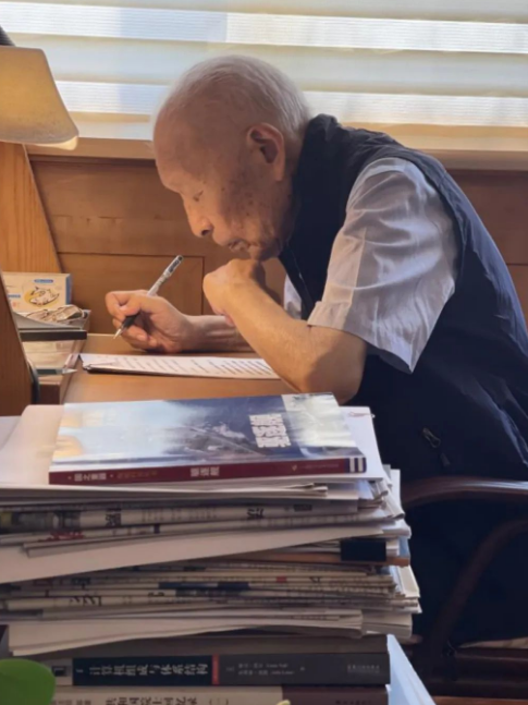 我是記者江曉晨。92歲的潘鏡芙左眼幾乎失去了感光能力,他把工作臺(tái)放在陽(yáng)臺(tái),這里采光好,方便他讀書(shū)寫(xiě)字。下午的陽(yáng)光透過(guò)玻璃,打在書(shū)本上。潘鏡芙向前探著身,平靜而專注,大約他還想離書(shū)本更近一些,看得再仔細(xì)一些,這樣才能趕上不斷移行的陽(yáng)光,趕上嘀嗒疾走的時(shí)間。