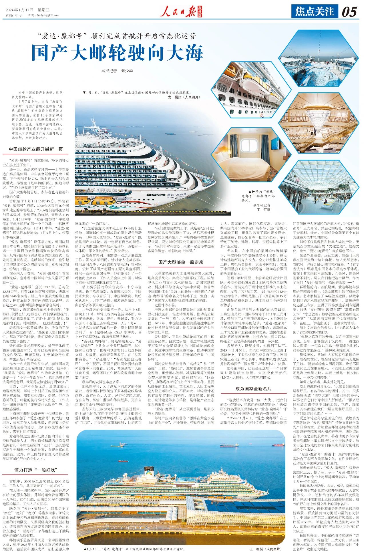 1月17日,人民日?qǐng)?bào)海外版第五版焦點(diǎn)關(guān)注刊發(fā)整版文章,聚焦“愛(ài)達(dá)·魔都號(hào)”。