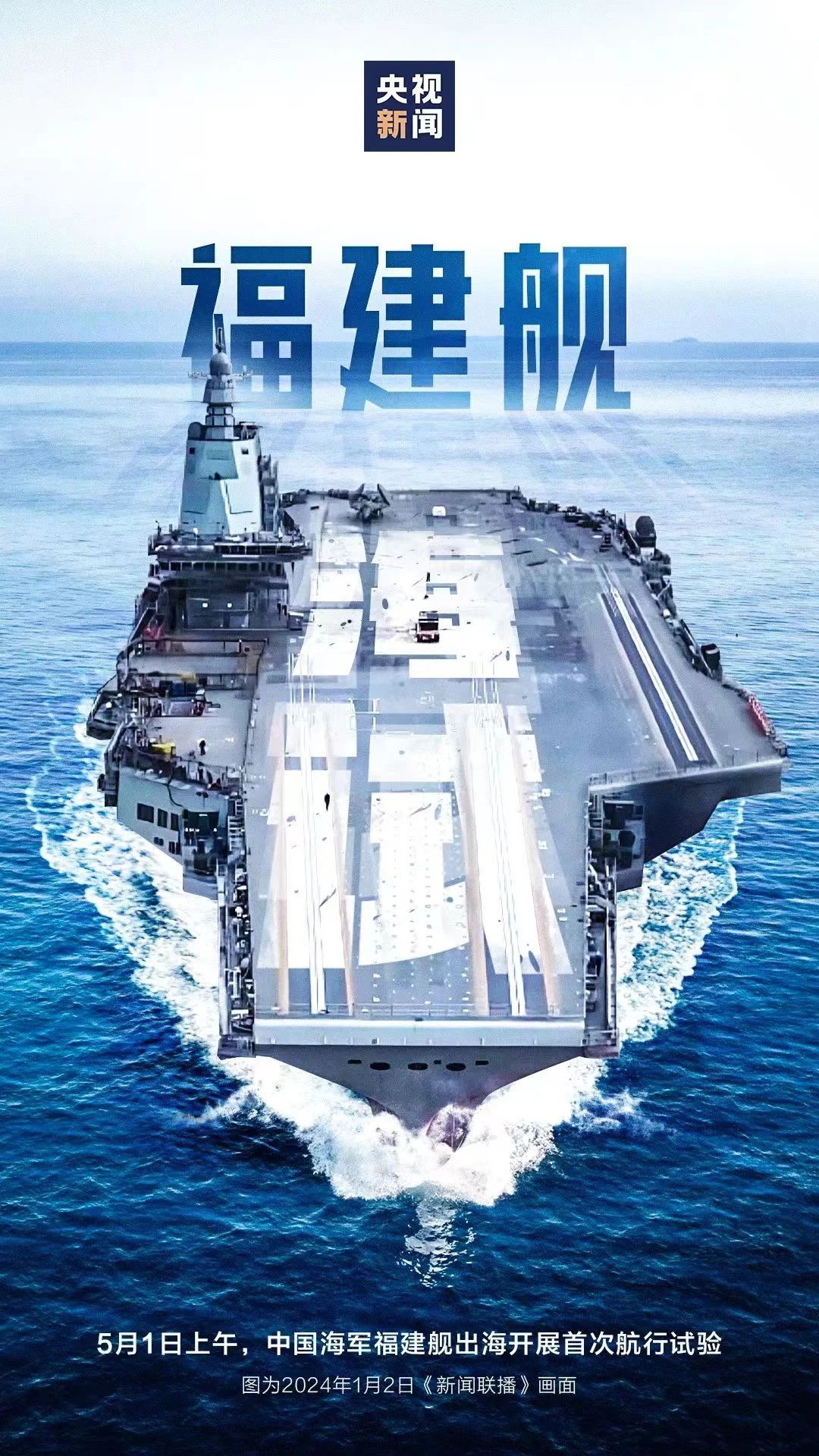 今天(5月1日)8時許,我國第三艘航空母艦福建艦從上海江南造船廠碼頭解纜啟航,赴相關海域開展首次航行試驗。
