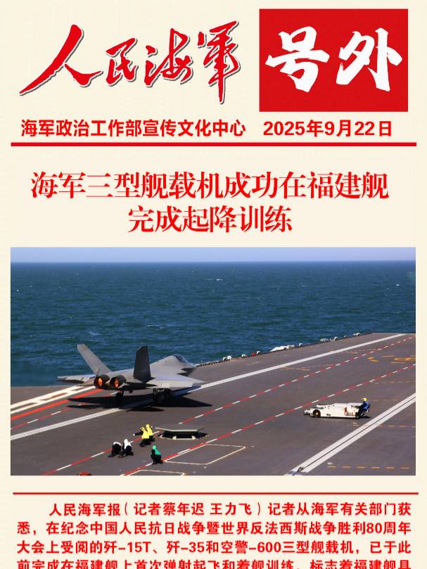 記者從海軍有關(guān)部門獲悉,在紀(jì)念中國人民抗日戰(zhàn)爭暨世界反法西斯戰(zhàn)爭勝利80周年大會上受閱的殲-15T、殲-35和空警-600三型艦載機(jī),已于此前完成在福建艦上首次彈射起飛和著艦訓(xùn)練,標(biāo)志著福建艦具備了電磁彈射和回收能力。這是我國航母發(fā)展歷程中取得的又一次突破,對推進(jìn)海軍轉(zhuǎn)型建設(shè)具有里程碑意義。